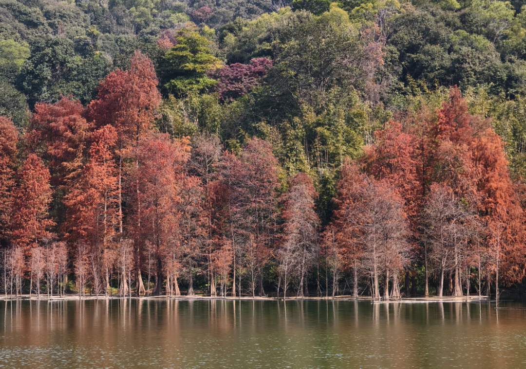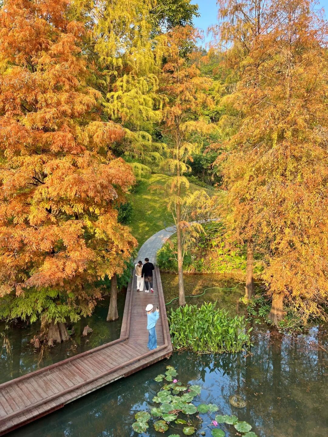 12月起至1月中旬,云溪植物园将迎来落羽杉的“高光季”。届时,成片树林将长入换上高深的锈红与古铜色,仿佛冬日点火的一簇簇火苗,又像洒在山林间的一幅巨幅油画,壮丽而诊疗。
