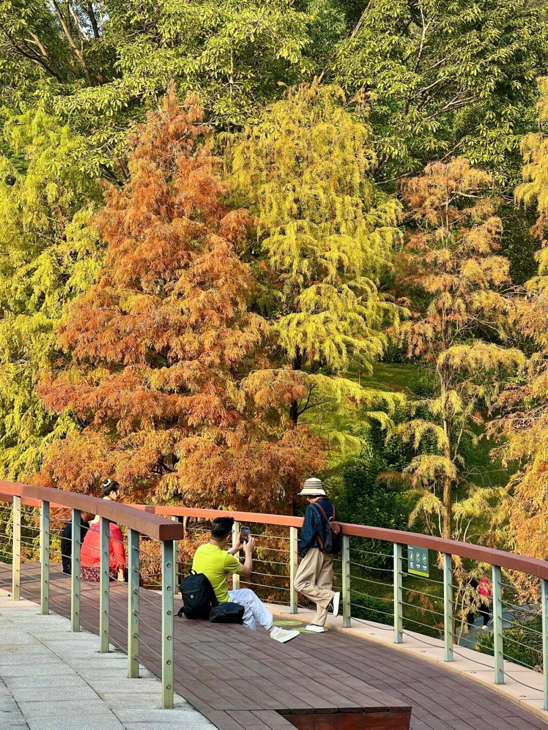 广州番禺医生山丛林公园里,落羽杉也正在献技“暖冬脚色秀”,由翠绿逐渐改动为金黄、橙红。